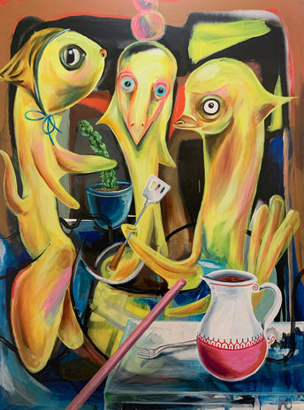 A closer examination reveals images that seem increasingly complex; both formally, and psychologically. Is that pathos roiling beneath the vibrant colors and apparent whimsy?